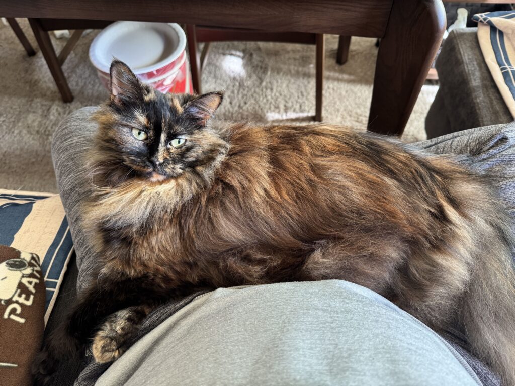 斑の爪切りはエリザベスカラーを首に巻いて、2週間に1度ふたりでやり、斑が用を足した後の猫砂の処理と、減った分の猫砂を足すのは、気がついた時にどちらかがやり、ブラッシングは主にわたしがやるが、妻は自動給水機を購入し、猫砂も定期購入し、トイレのシートは3〜4日で交換し、月一でトイレを風呂場で水洗いして猫砂も全取っ替えし、ウェットフードは斑の好みのものを特価の時に各種箱買い・まとめ買いし、食欲がなかったり、排便をしていないと心配し、斑が居間にいないと、