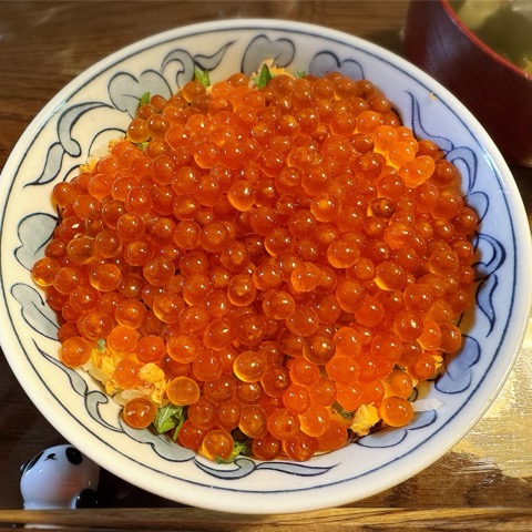 妻が鮭の生筋子を塩少々の40℃のお湯でほぐし、10分ほど酒に漬けてから酒は捨て、いくら200gに酒大さじ2、醤油大さじ1、味醂大さじ1で漬けた。 晩酌後、丼にご飯を盛... -