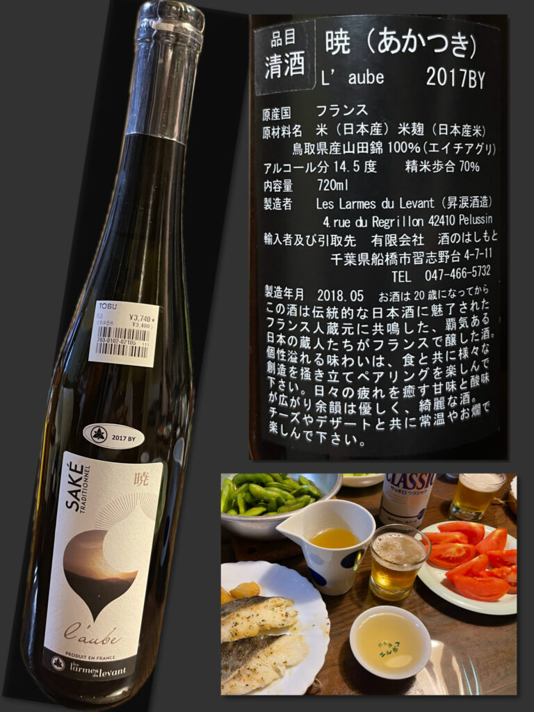 写真の四合瓶(720ml)は、フランス産日本酒『暁[あかつき]』。ワインのレギュラーボトル(750ml)に似ている。ボトルのラベルには、 この酒は伝統的な日本酒に魅了... -
