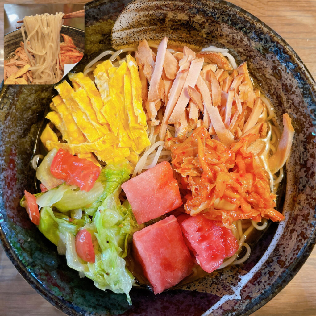 昼食は自宅で流水解凍の冷麺(信越明星)を食べた。色とりどりのトッピングは妻が用意して盛り付けたもの。 冷麺の食感は、例えようではゴムを食べているような独特... -