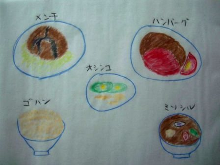 イラストだが、メンチにはソースがかかっているところやキャベツが敷かれているところが描かれ、ハンバーグにはケッチャップがかかっているのだろうか、横にはトマトが描かれ、お新香は何なのか分からないが、味噌汁には数種類の具が描かれ、まぁ細かく画かれている。
