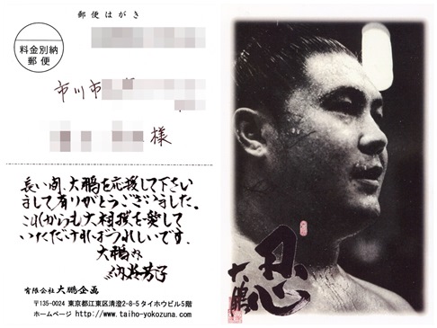 昨夜、帰宅すると郵便受けに今年1月に逝去した大鵬親方の奥さん直筆のお礼はがきが届いていた。