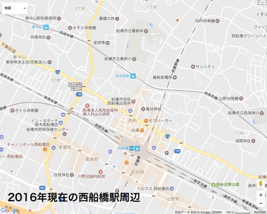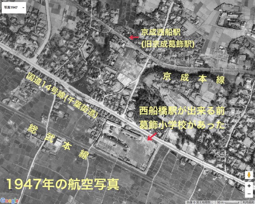 そこで、過去の西船橋駅周辺の地図を調べてみると、現在の西船橋駅下り総武線普通の線路より北側から国道14号線までの四方を囲む一体が葛飾小学校だったようだ。