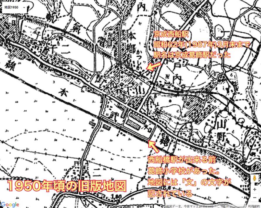 今の西船橋駅が位置する場所には、かつて葛飾小学校の校舎とグラウンドがありました。(まいぷれ[船橋市]より引用)