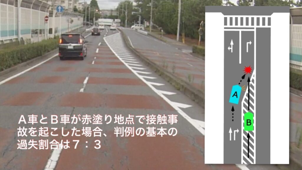 画像のA車が右ウインカーを点滅させて右折してきて、ゼブラゾーンを直進してきたB車と、赤塗り地点で接触事故を起こした場合、A車とB車との過失割合は7:3の判例の基本になってる。ケースによっては5:5になった判例もあるが、割合がA車<B車になることはない。なお、ポールで仕切られたゼブラゾーンには進入してはならない。