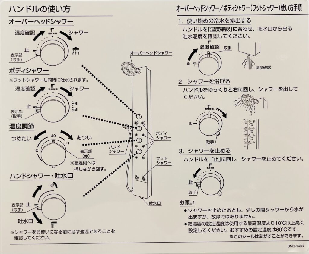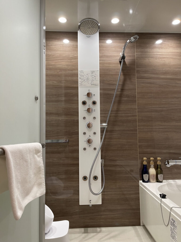 こんなシャワー機見たことがない。本体上からオーバーヘッドシャワー、ボディーシャワー、フットシャワーがあり、この他に通常のハンドシャワーが付いている。