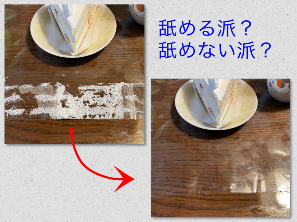 ただ、生クリームの気持ちになってみよう。生クリームはケーキフィルムに引っ付くために生まれてきたのではない。わたしたちに食べてもらいひと時の幸福を与えるために生まれてきたのだ。それをフィルムに引っ付いたからと、ふんと捨てられますか? 勿体無いではないか。生クリームに無礼ではないか。それにフィルムに生クリームがべっとり付いたら悔しいことだろう。