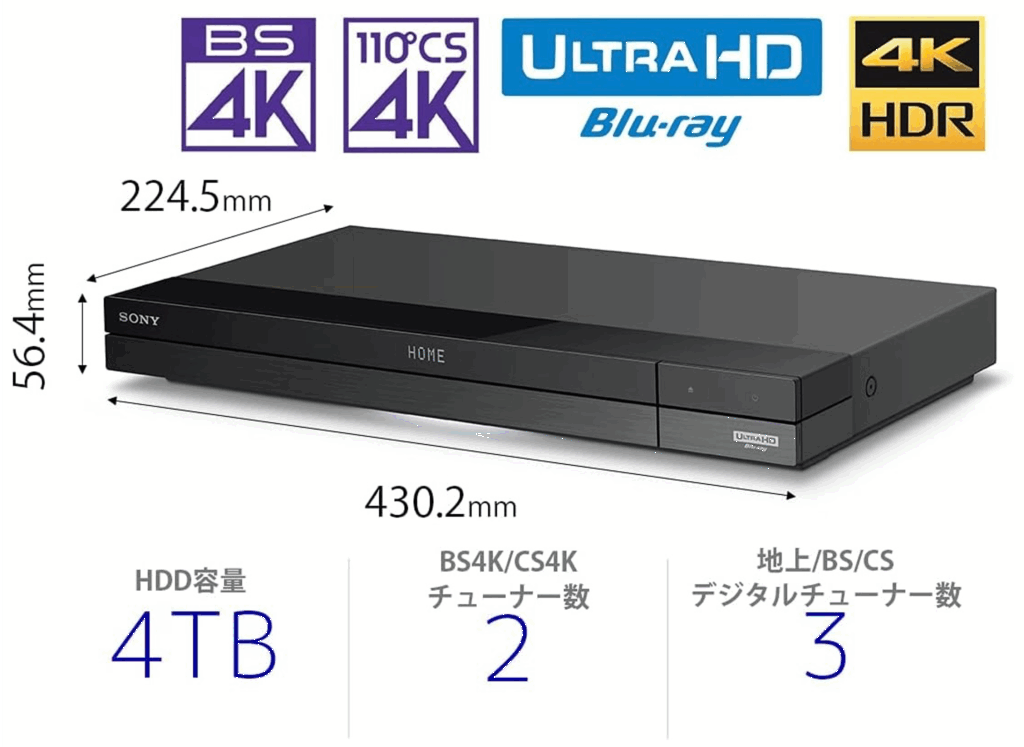 そして、浮いたお金で? ブルーレイレコーダーも新たに購入した。既存のPanasonic製ブルーレイレコーダーはもう1台のテレビで使っているがHDD320GBと少なめで、居間のテレビで使っていたPioneer製DVDプレーヤーも故障して使えなかったからだ。HDD4TBで4K録画もでき、加えて3番組同時録画もできるので、見たい番組が同時刻もしくは時間差で時刻が重なる時の録画に便利だ。