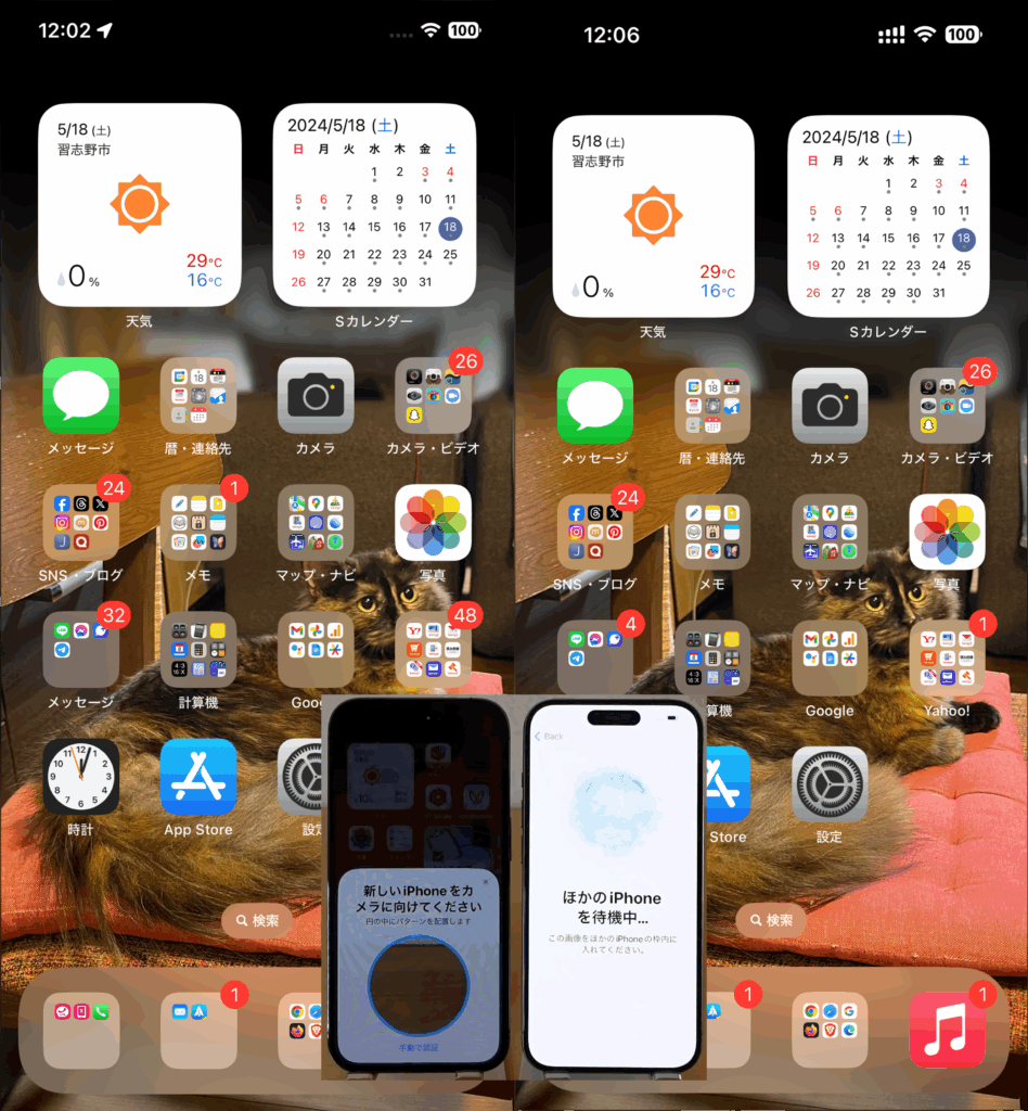 帰宅して旧iPhoneから新iPhoneへのデータ転送は、わたしがクイックスタートで行った。過去のiPhoneではiTunesで旧iPhoneのバックアップを取り、新iPhoneにリストアしていたが、これだとライトニング×USBケーブルを使い、パソコンを介さなければならない。