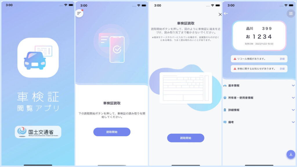 - スマホに「車検証閲覧アプリ」をインストールしてICタグを読み取る(初回のみ)と、個人情報が記載された「自動車検査証記録事項」の確認ができ、PDFファイルのダウンロードもできる