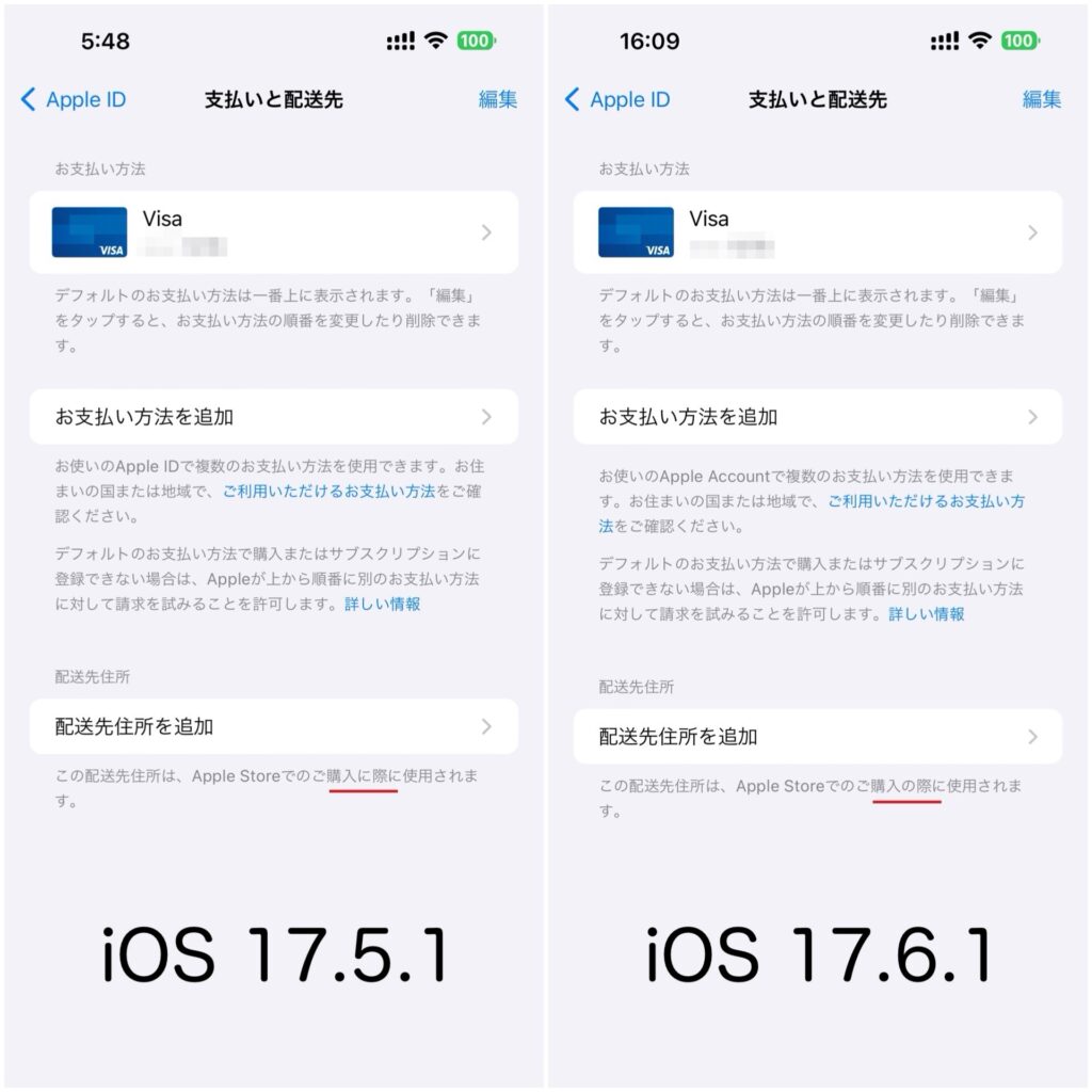 このような軽微なバグは、iOS 17.5.1の時もあり、それが2枚目の画像になる。アップデート前の赤線部分は、”購入に際に” と誤字があったが、iOS 17.6.1では、”購入の際に” と正しく修正された。