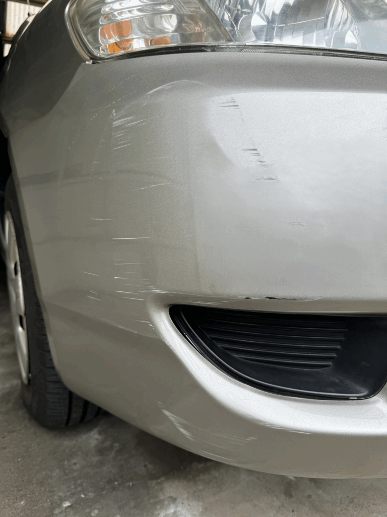 3日前の午後、車で外出するのに車庫のシャッターを開けたらガビーン😳 フロントバンバーの運転席側の角に無数の擦り傷があった。