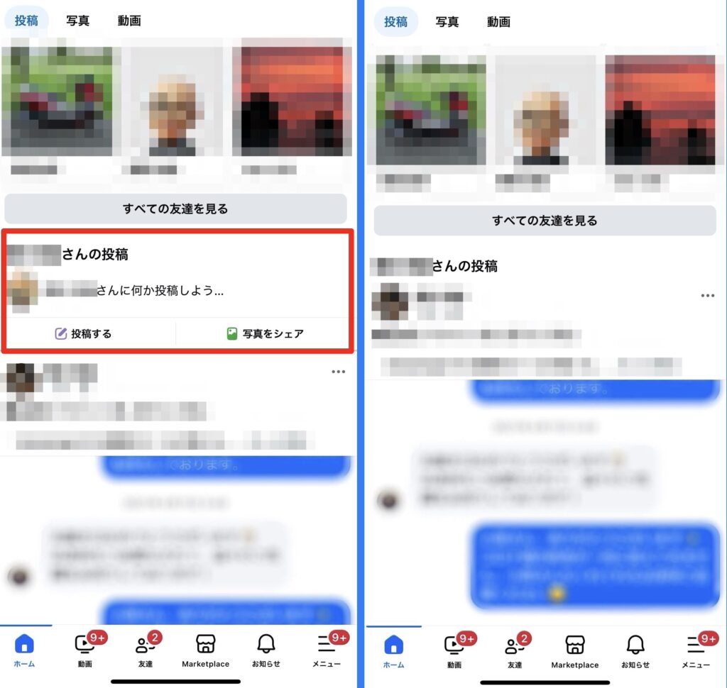 さて、画像1枚目はわたしの2パターンのタイムラインの一部。左右の違いは左の赤線で囲んだ部分の有り無し。(自分のアカウントからは確認できないので、妻のアカウントからわたしのタイムラインを表示したもの)