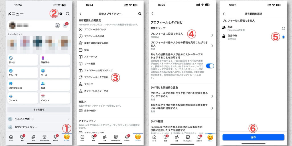 さて、Facebookの使い方は、十人十色いろいろあると思うが、意図するところがないのなら、自分のタイムラインに投稿できる人は「自分のみ」がいいのではないだろうか。お祝いもmessengerからしていただける。「自分のみ」に設定したい人は以下の手順で変更(初期値=友達)。