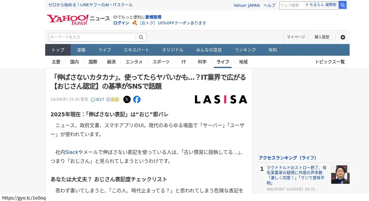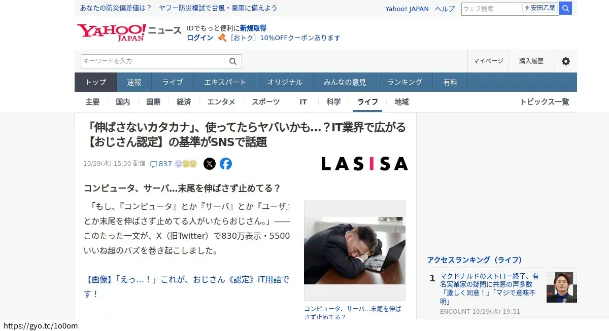 【魚拓】「伸ばさないカタカナ」、使ってたらヤバいかも…?IT業界で広がる【おじさん認定】の基準がSNSで話…