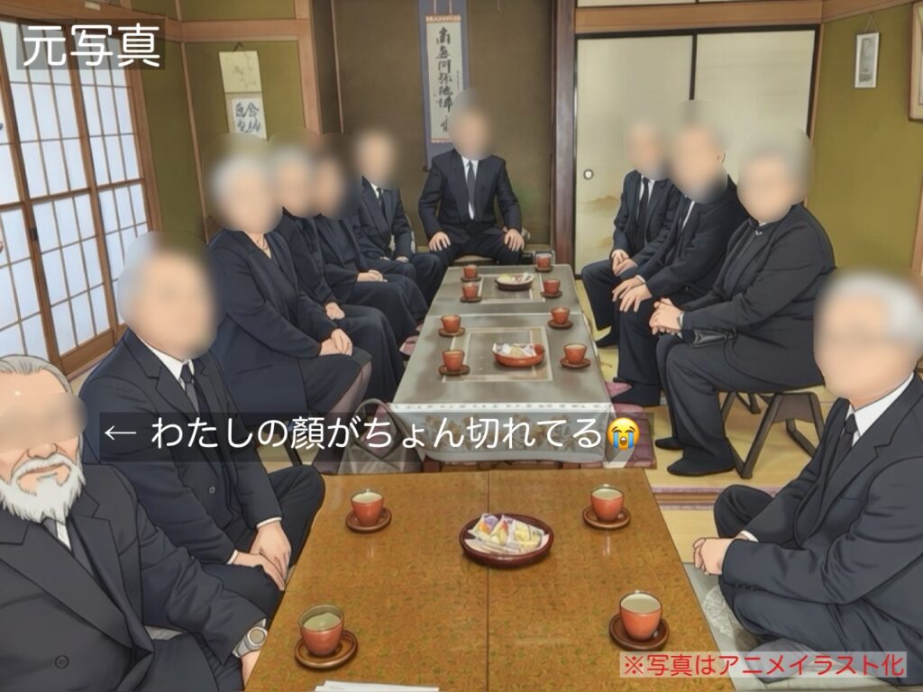 さて、「元写真」は、出席した親戚たちとの集合写真。従妹が撮ったものだが、あれ〜わたしの顔がちょん切れてる。