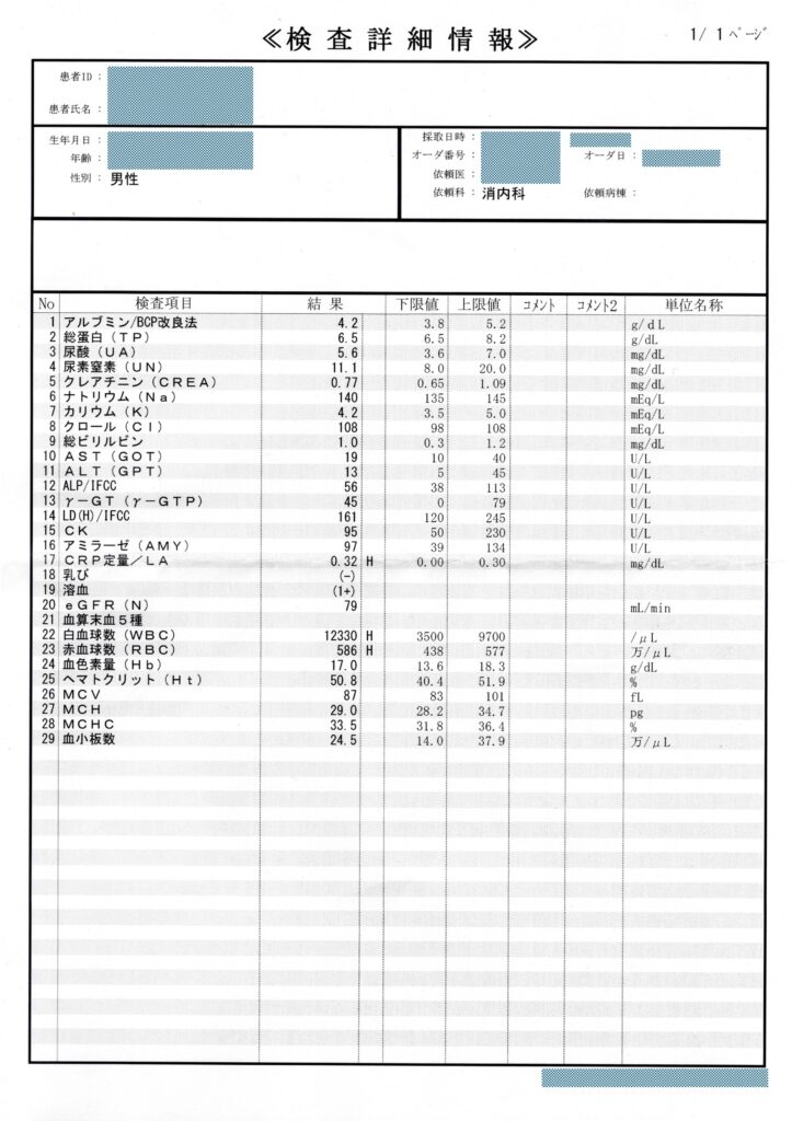 血液検査の『検査詳細情報』では、CRP、WBC、RBCの数値が高いが、医師からは腰痛で炎症を起こしている影響と言われた。他の数値は皆基準範囲内だった。
